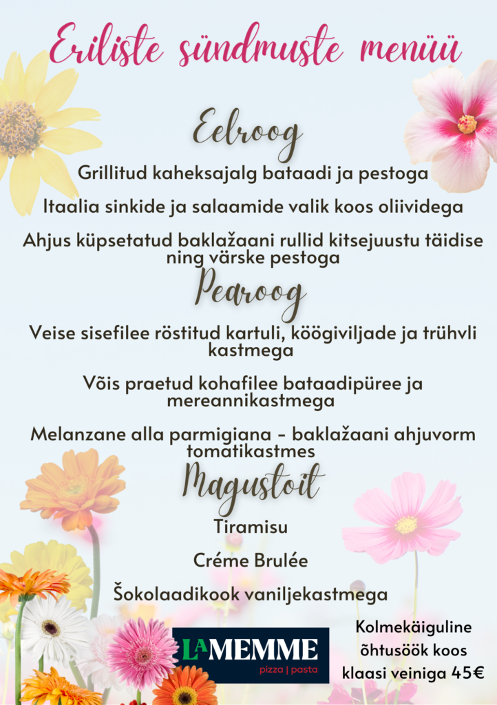 Eriliste sündmuste menüü on loodud suurematele seltskondadele, et muuta iga koosviibimine meeldejäävaks ja sujuvaks. See sobib suurepäraselt sünnipäevade, juubelite, firmapidude ning teiste tähtpäevade ja ürituste tähistamiseks. Hoolikalt valitud road ning läbimõeldud serveerimine loovad piduliku atmosfääri ja võimaldavad külalistel nautida nii maitseelamusi kui ka üksteise seltskonda.